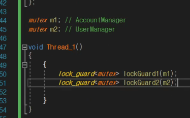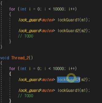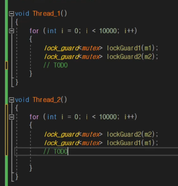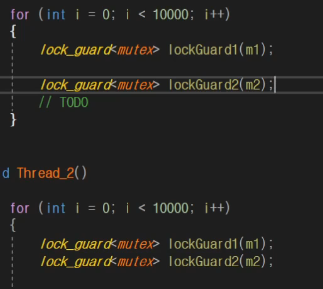 이 이유는 두개가 락 잡는 순서가 꼬여있어서 발생 (m1 <-> m2)