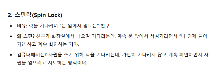 - 단점: 락이 오래 걸려 있다면 CPU를 낭비하게 돼.