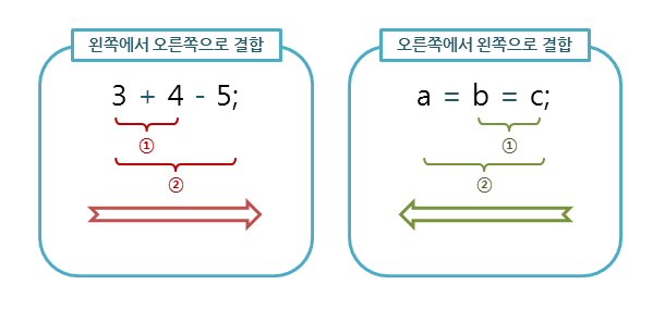 - 같은 우선순위를 가지는 연산자가 둘 이상 있을 때에는 결합 순서에 따라 실행 순서가 결정