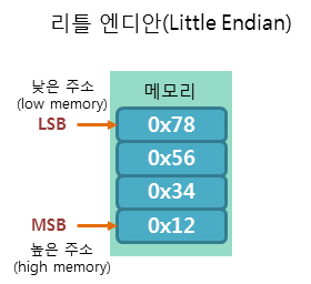 리틀 엔디안 방식은 낮은 주소에 데이터의 낮은 바이트(LSB, Least Significant Bit)부터 저장하는 방식