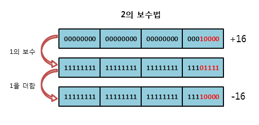 🌟 해당 양수의 모든 비트를 반전한 1의 보수에 1을 더하여 음수를 표현하는 방법