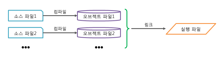 작성된 모듈(module)은 개별적으로 컴파일된 후, 링커에 의해 하나의 실행 파일로 만들어짐