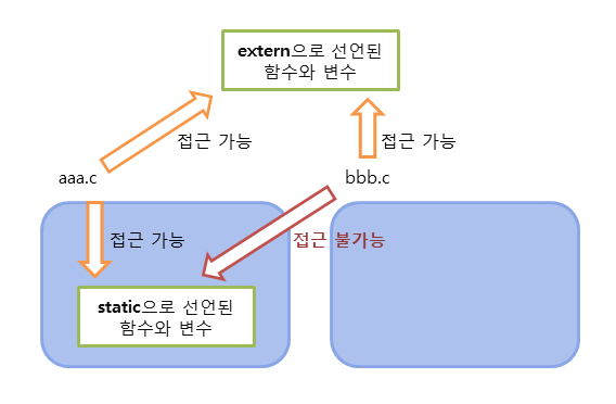 분할 컴파일 방식에서 소스 파일 사이의 상호 참조는 전역 변수와 전역 함수만 가능