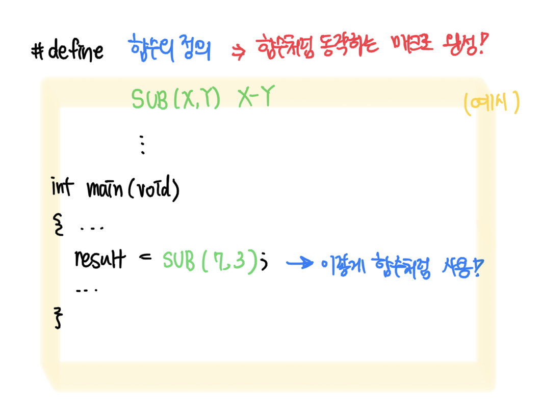 🌟 C 언어에서는 #define 선행처리 지시문에 인수로 함수의 정의를 전달하며 함수처럼 동작하는 매크로를 생성할 수 있음