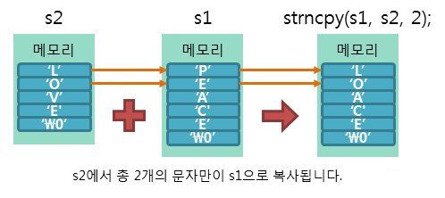 👉 strncpy()함수는 널 문자를 만나거나, 추가하는 문자의 개수가 세 번째 인수 길이에 도달할 때까지 추가