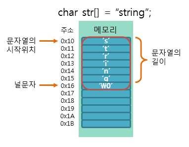 따라서 문자열에 속한 데이터가 끝나면, 문자열의 끝을 의미하는 문자(NULL)를 하나 더 삽입함