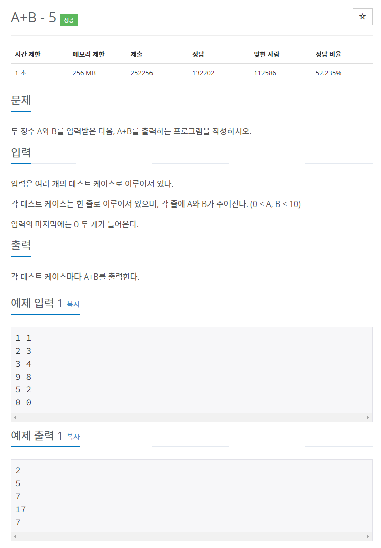 break; // 입력 종료 조건: A와 B가 모두 0이면 종료