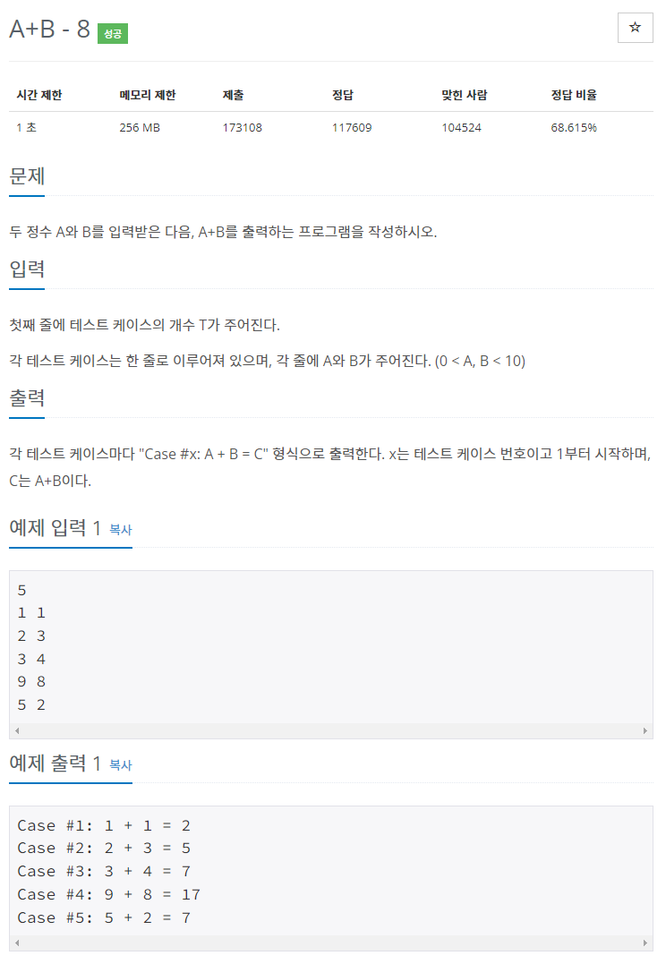 printf("Case #%d: %d + %d = %d\n", (i+1), A, B, sum); // 합을 출력