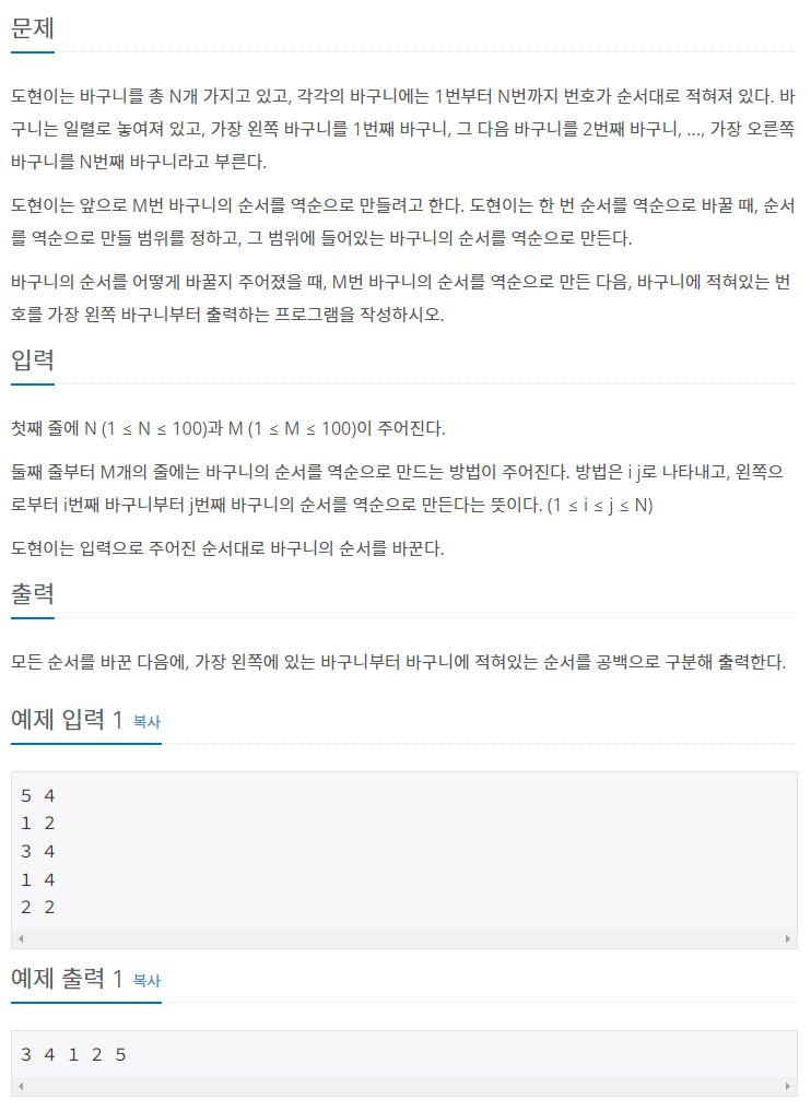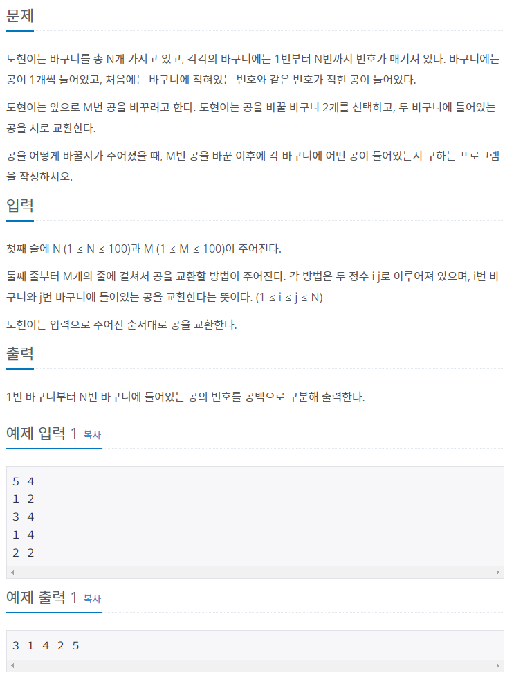 scanf("%d %d", &N, &M); // 바구니 개수 N과 바구니 순서 변경 횟수 M 입력 받기