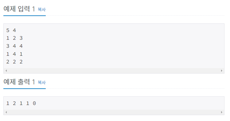 int n, m; // 바구니의 개수와 공을 넣는 방법의 개수를 저장할 변수