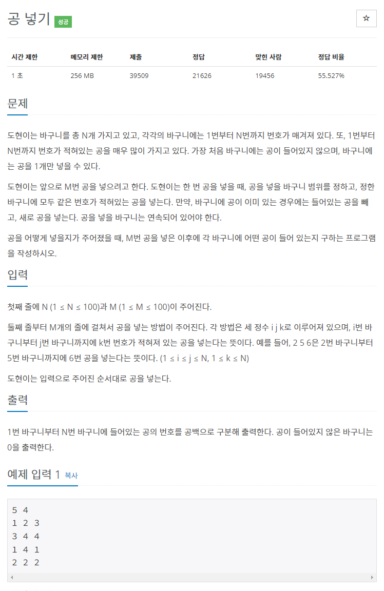 a부터 b까지의 바구니에 c 번호의 공을 넣음 - 모든 바구니의 상태를 출력한다.