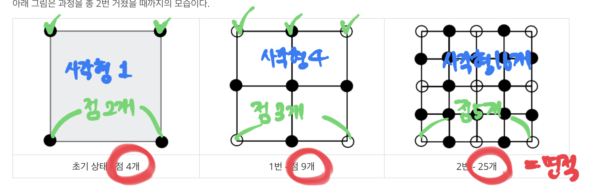 2903_중앙 이동 알고리즘 링크 https://www.acmicpc.net/problem/2903 풀이 너무 깊게 생각하지 말고 점이 일정한 간격을 두고 채워져 있기 때문에 점을 이용해서 면적을 구한다고 생각해봅시다. 사각형들은