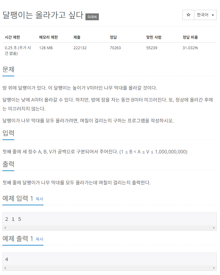 b) 아니면 n = (V-A)/(A-B) + 2로 계산 (하루를 더해야 하니까) - days 출력