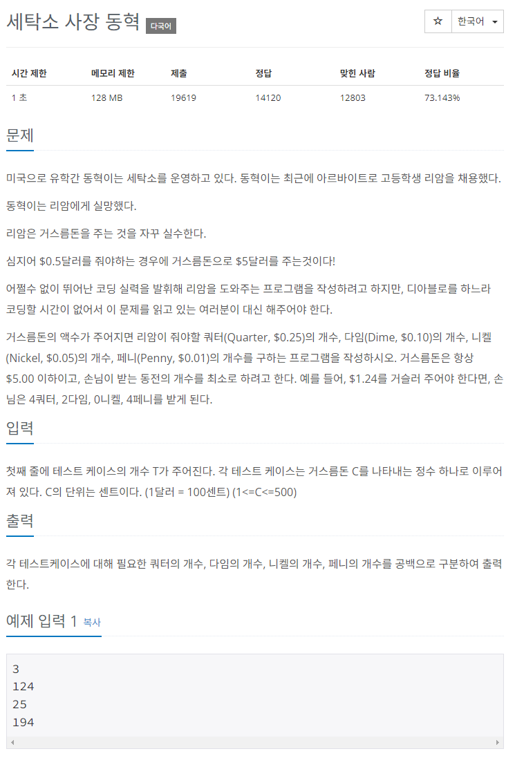 C %= 25; // 쿼터를 제외한 나머지 거스름돈 계산