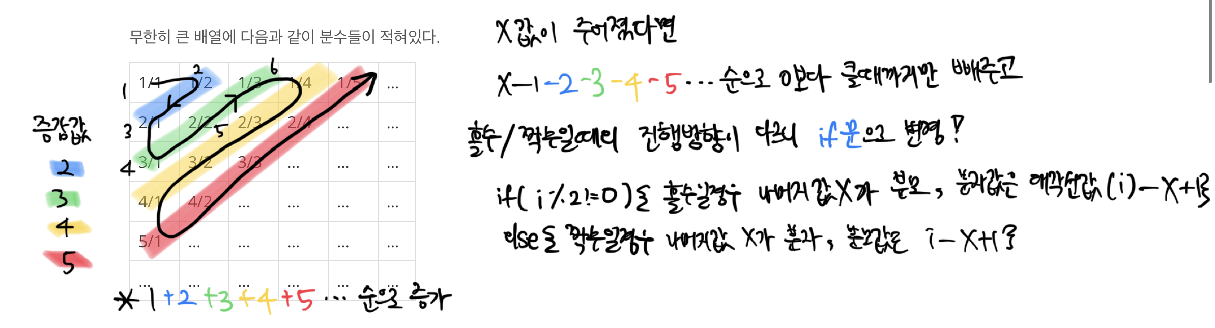 // 짝수 라인일 경우 분자는 X, 분모는 line - X + 1