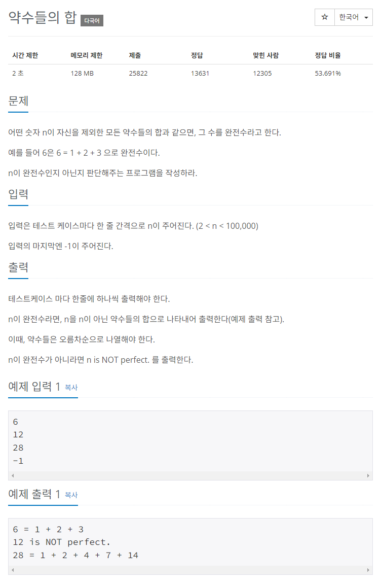 약수를 구하면서 주어진 수가 완전수인지 판별하는 문제