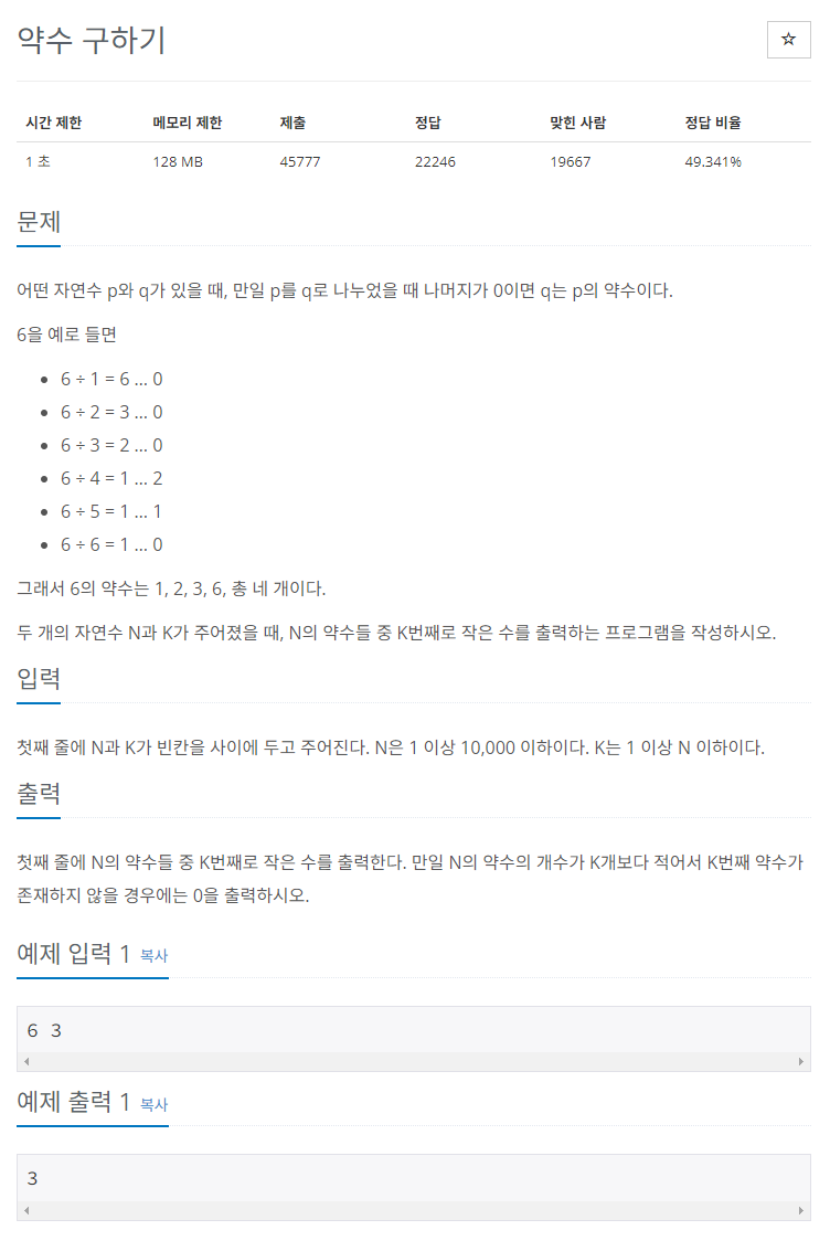 https://www.acmicpc.net/problem/2501 2501번: 약수 구하기 첫째 줄에 N과 K가 빈칸을 사이에 두고 주어진다. N은 1 이상 10,000 이하이다. K는 1 이상 N 이하이다. www.acmicpc.net 문제 어떤 자연수 p와 q가 있을 때,