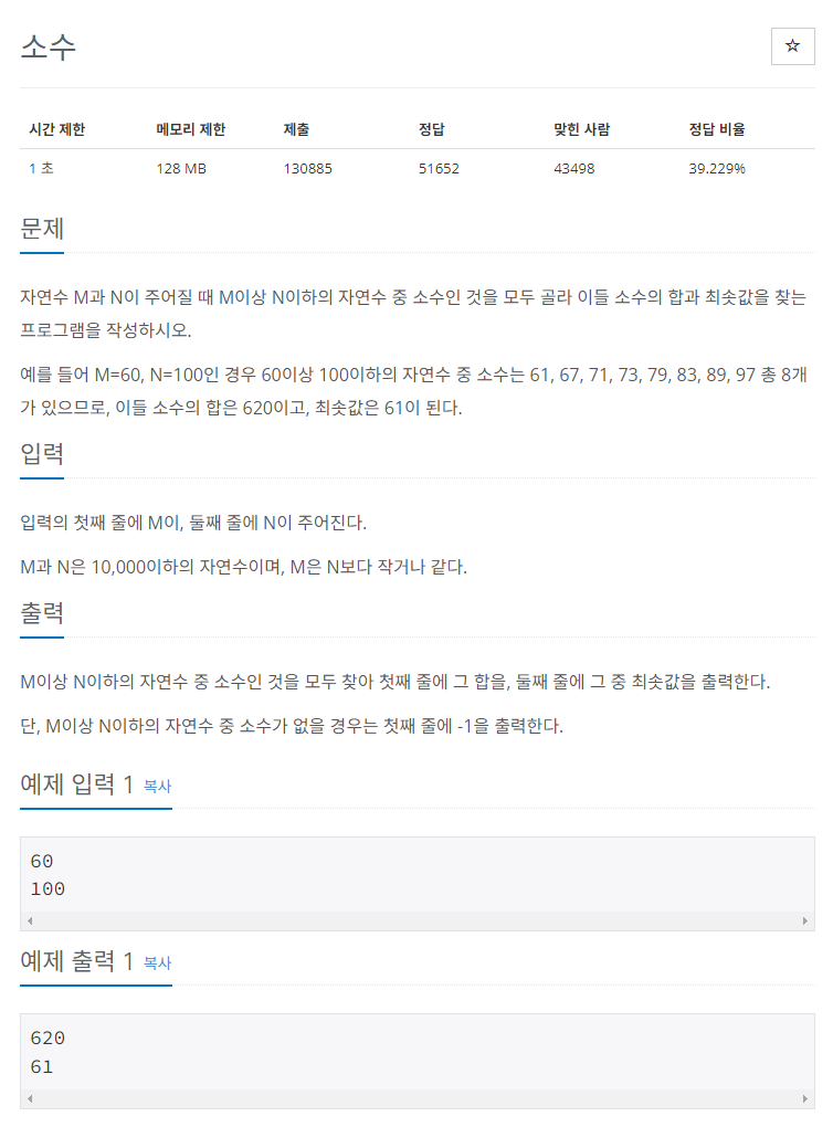 - 소수 중 최솟값을 저장할 변수 min을 큰 값으로 초기화