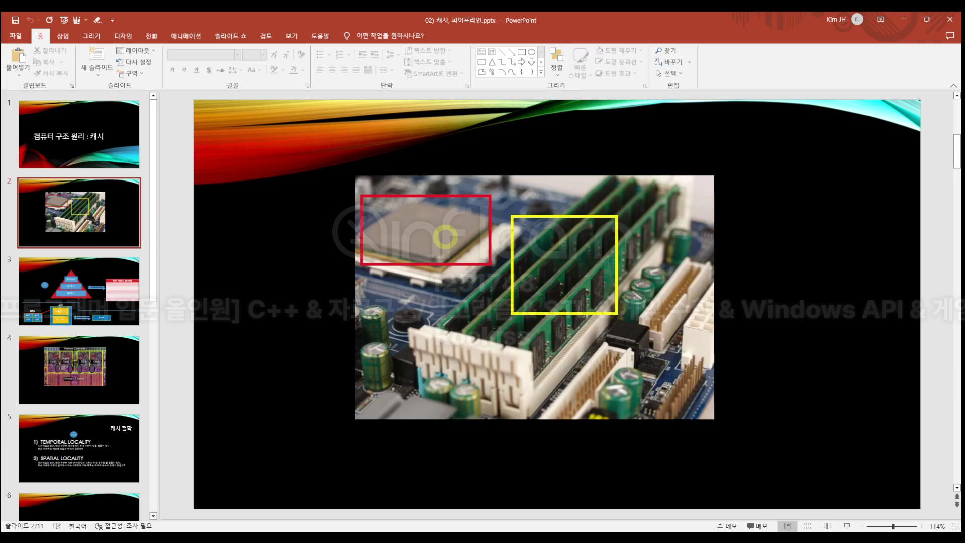 [게임 프로그래머 입문 올인원] 멀티쓰레드 프로그래밍 : 캐시와 CPU 파이프라인 A. 캐시와 CPU 파이프라인1. 캐시a. 캐시 기초컴퓨터 구조 원리 : 캐시 레드 : cpu 노란색 : 메모리전기가 아무리 빨라도 물리적으로 좀 멀어보임 (데이터 낭비) 따라서 캐시를 사용함 b. cpu의 캐시관리 레지스터는 cpu의 손발아래 캐시들은 단기기억장치 (서빙할 때 메모장 같은 것) c. 캐시 철학 물리적으로 모든 데이터를 가져오지 않고잠시 기억해두는것! ==> 이것이 캐시 d. 캐시 실습접근하는 비용이 얼마나 걸렸는지 테스트하기 버퍼를 하나 생성하고 GetTickCount64로 시간을 재고반복문을 사용해 버퍼에 넣어주기 그럼 버퍼에는 캐시가 [a] [b] [c] [d] [e] [f] [g] [h] [i] [j] [k] 이런식으로 저장되게 되는데 위와 같은 코드지만 추가로 j,i를 .. 운영체제 2024.12.03